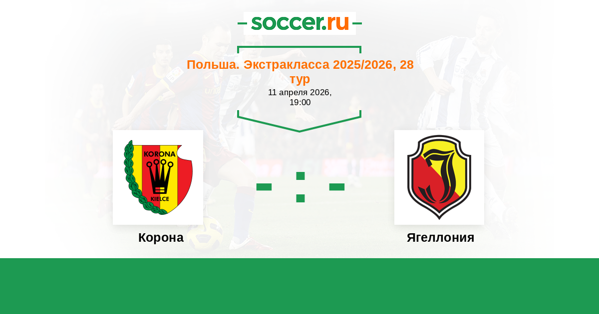 Польша. Экстракласса 27.04.2025 Корона Логотип футбольный клуб Корона (Кельце) 3:1 Логотип футбольный клуб Ягеллония (Белосток) Ягеллония