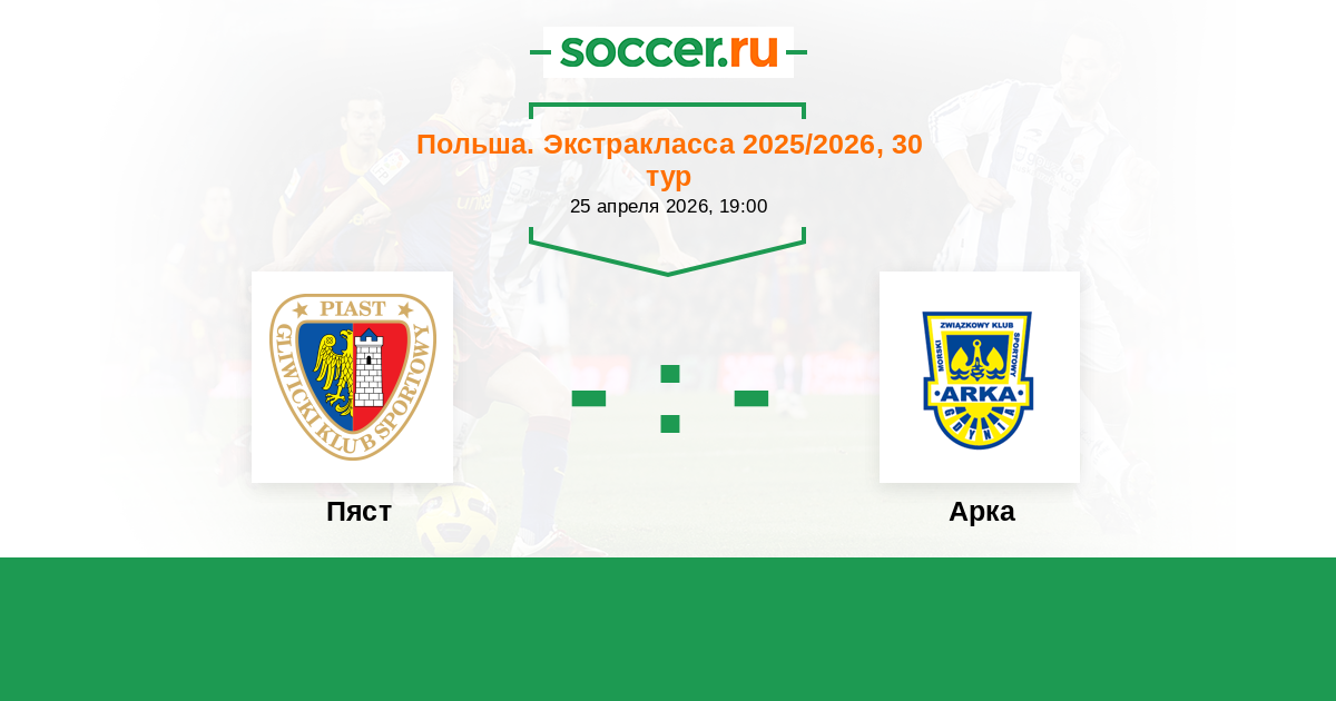 Польша. Экстракласса 27.04.2018 Арка Логотип футбольный клуб Арка (Гдыня) 1:5 Логотип футбольный клуб Пяст (Гливице) Пяст
