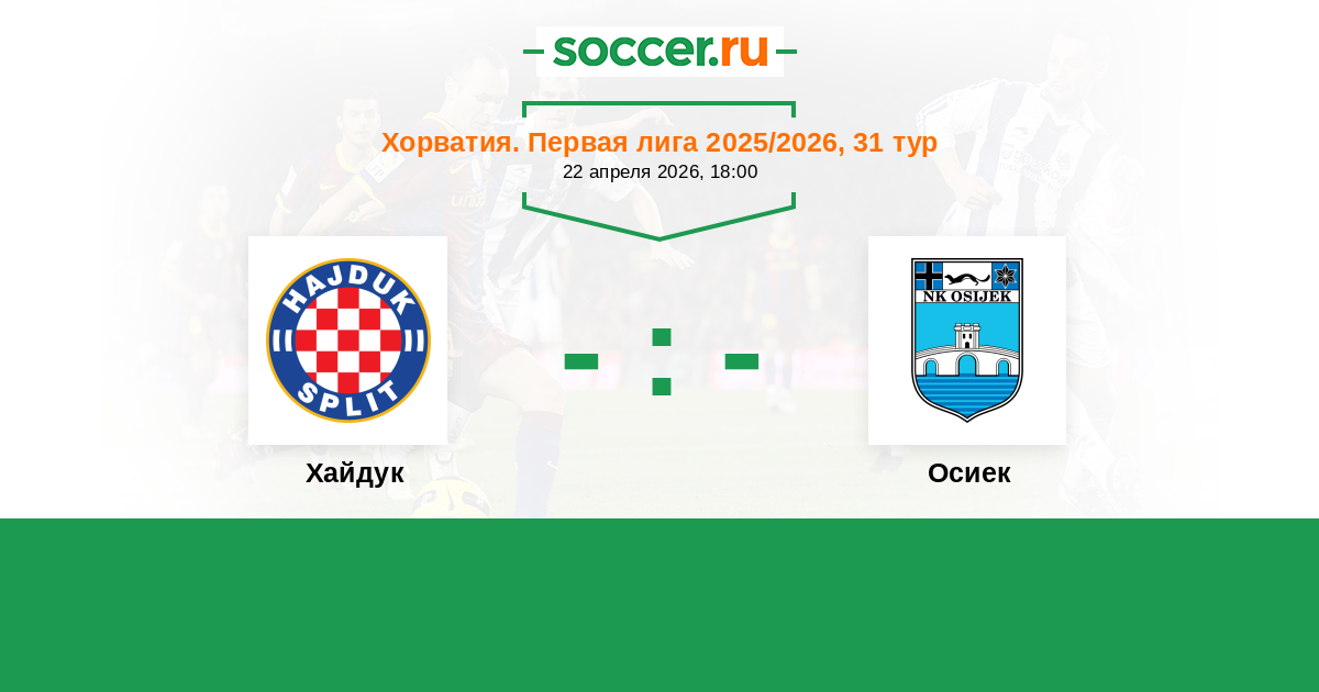 Хорватия. Первая лига 14.04.2024 Хайдук Логотип футбольный клуб Хайдук (Сплит) 1:2 Логотип футбольный клуб Осиек Осиек