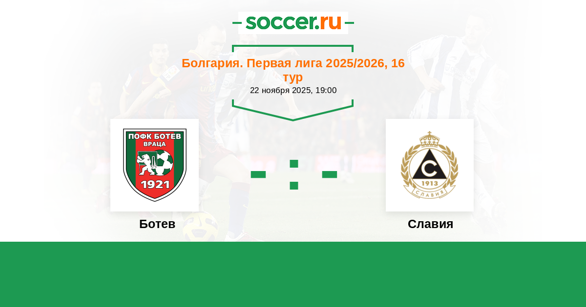 Болгария. Первая лига 14.04.2025 Славия Логотип футбольный клуб Славия (София) 4:2 Логотип футбольный клуб Ботев (Враца) Ботев