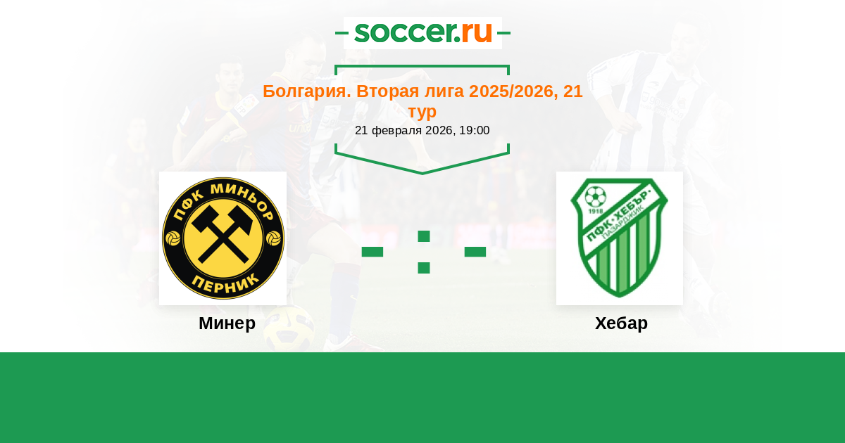 Болгария. Вторая лига 30.07.2021 Хебар Логотип футбольный клуб Хебар (Пазарджик) 1:1 Логотип футбольный клуб Минер (Перник) Минер