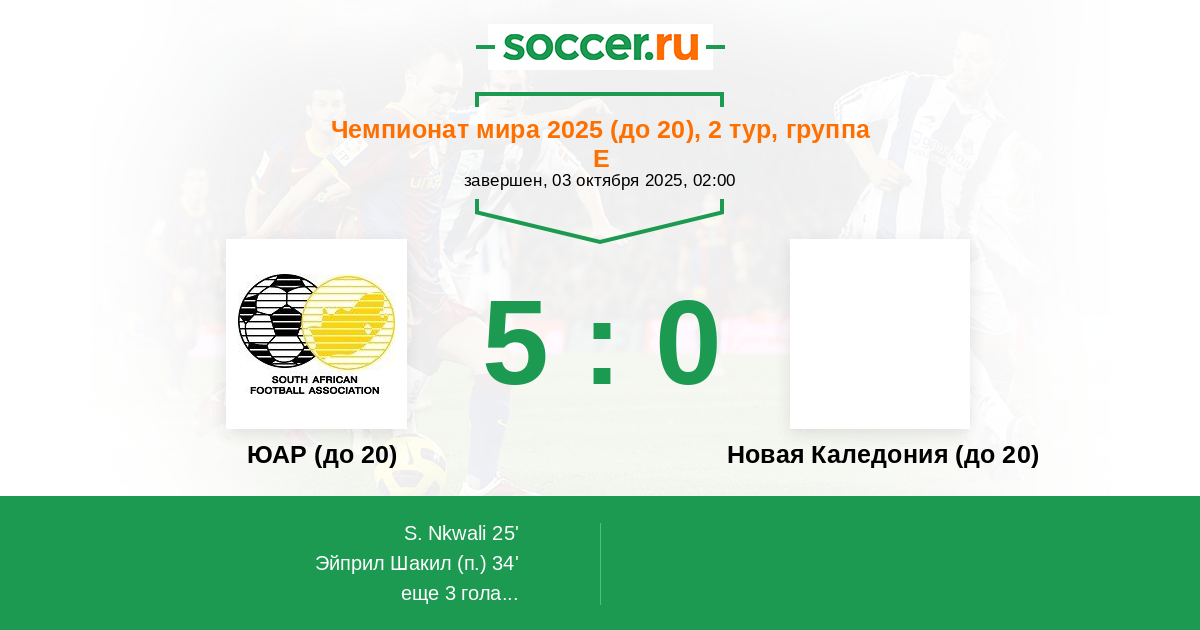 Протокол матча ЮАР (до 20) против Новая Каледония (до 20)