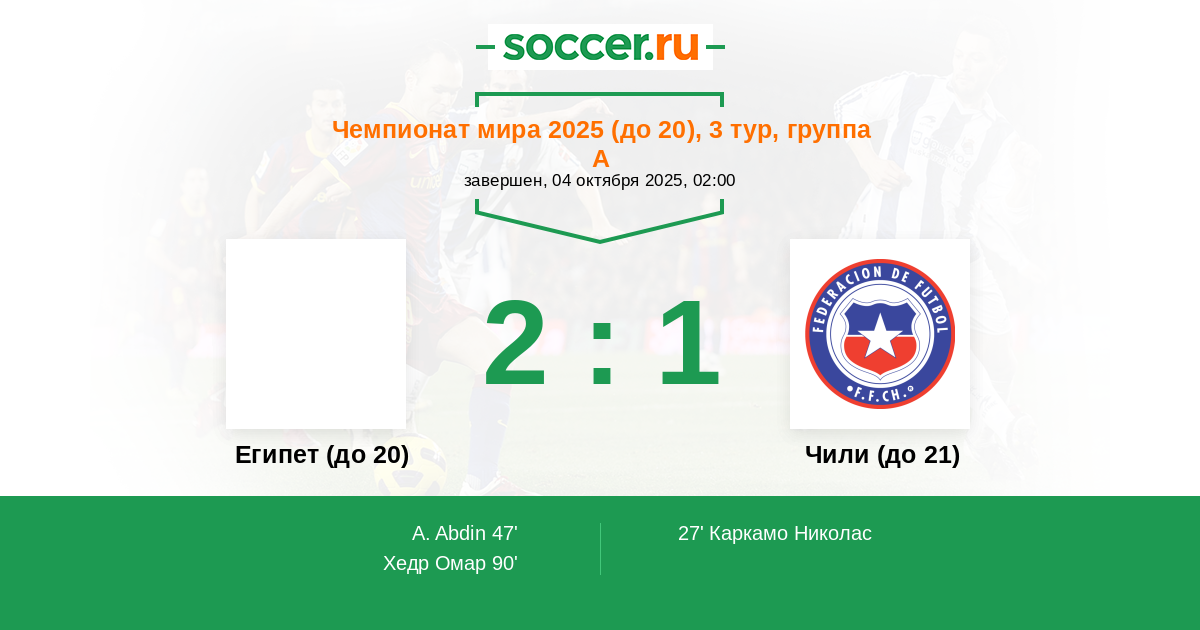 Протокол матча Египет (до 20) против Чили (до 21)