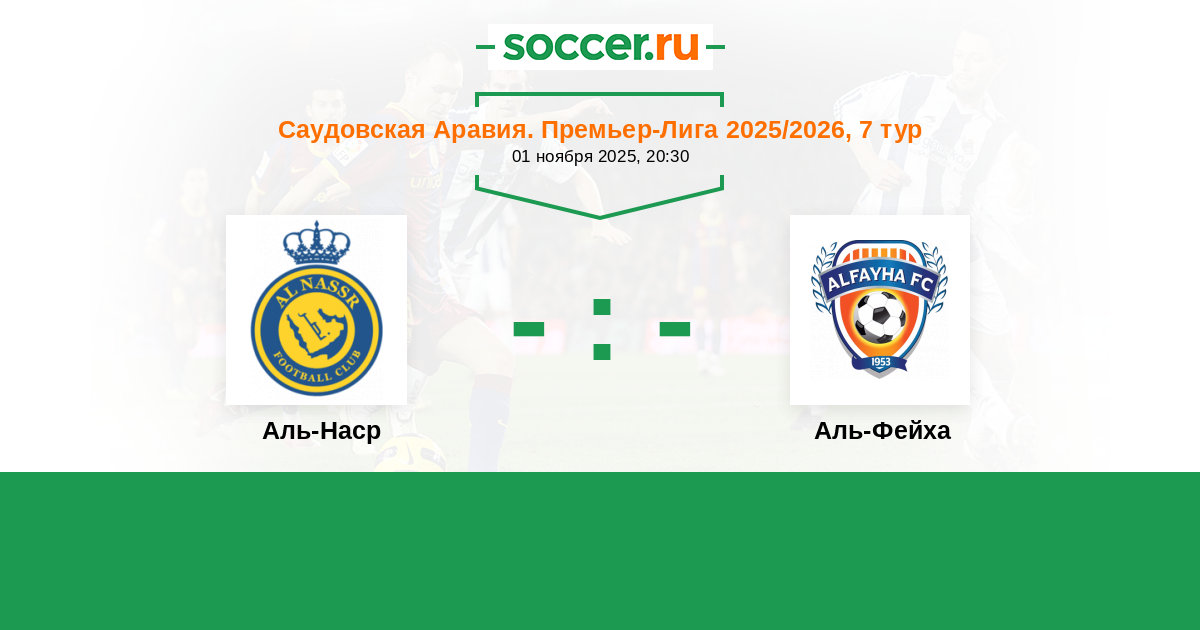 В предстоящем матче 7 - го тура Премьер-Лиги Саудовской Аравии между командами Аль-Наср Ар-Рияд и Аль-Фейха , более чем явным фаворитом на победу является команда хозяев Аль-Наср , так как они играют лучше