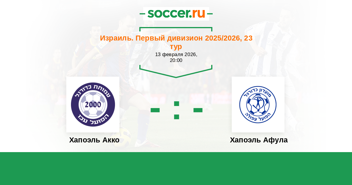 Израиль. Первый дивизион 18.02.2020 Хапоэль Акко Логотип футбольный клуб Хапоэль Акко 0:1 Логотип футбольный клуб Хапоэль Афула Хапоэль Афула