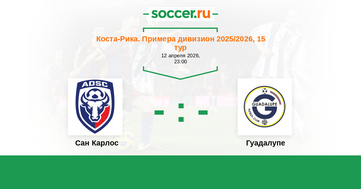 Коста-Рика. Примера дивизион 20.04.2023 Гуадалупе Логотип футбольный клуб Гуадалупе 2:3 Логотип футбольный клуб Сан Карлос (Сьюдад Куэсада) Сан Карлос