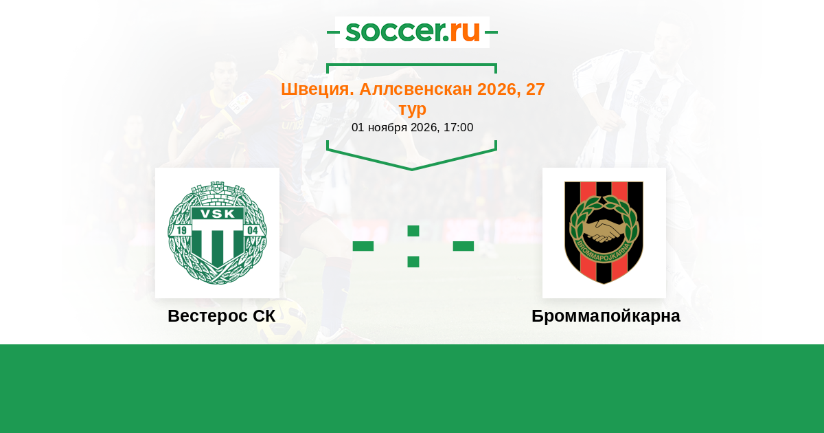 Швеция. Аллсвенскан 26.05.2024 Вестерос СК Логотип футбольный клуб Вестерос СК 1:1 Логотип футбольный клуб Броммапойкарна (Стокгольм) Броммапойкарна