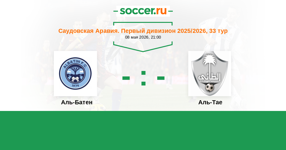 Саудовская Аравия. Первый дивизион 18.10.2019 Аль-Батен Логотип футбольный клуб Аль-Батен (Хафар-аль-Батен) 2:1 Логотип футбольный клуб Аль-Тае (Хаиль) Аль-Тае