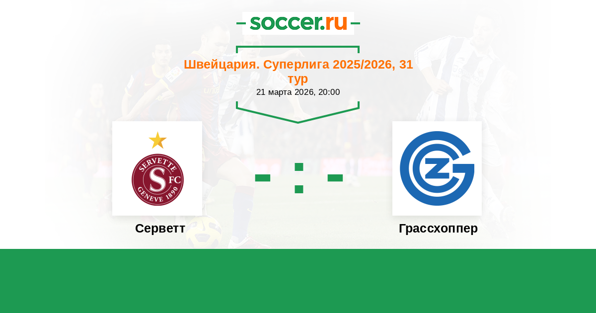 Швейцария. Суперлига 01.02.2025 Серветт Логотип футбольный клуб Серветт (Женева) 1:1 Логотип футбольный клуб Грассхоппер (Цюрих) Грассхоппер
