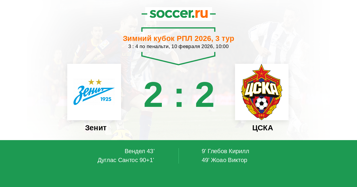 Зимний кубок РПЛ 04.02.2025 Зенит Логотип футбольный клуб Зенит (Санкт-Петербург) 2:2 (4:1) Логотип футбольный клуб ЦСКА (Москва) ЦСКА