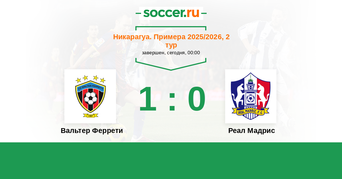 Никарагуа. Примера 07.03.2021 Вальтер Феррети Логотип футбольный клуб Вальтер Феррети (Манагуа) 2:0 Логотип футбольный клуб Реал Мадрис (Сомото) Реал Мадрис