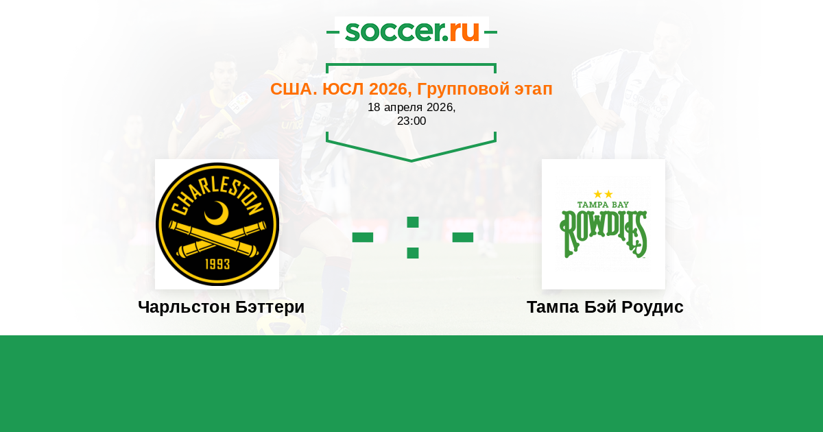 США. ЮСЛ 27.03.2023 Чарльстон Бэттери Логотип футбольный клуб Чарльстон Бэттери 3:0 Логотип футбольный клуб Тампа Бэй Роудис (Санкт-Петербург, Флорида) Тампа Бэй Роудис