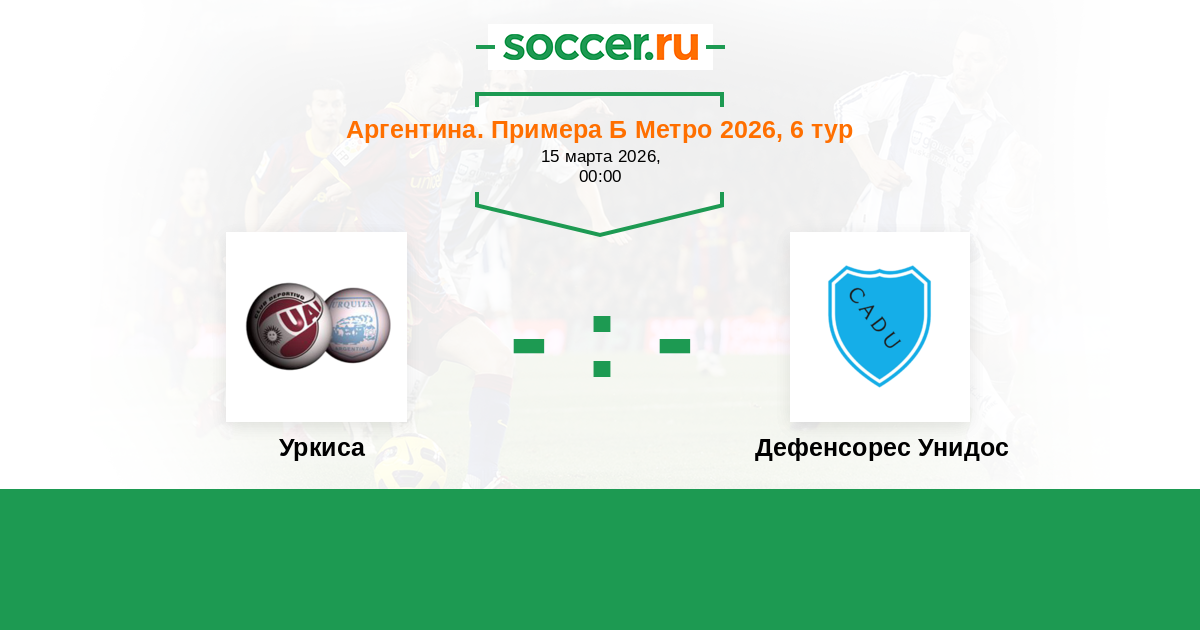 Аргентина. Примера Б Метро 16.04.2022 Уркиса Логотип футбольный клуб Уркиса (Вилья Линч) 0:2 Логотип футбольный клуб Дефенсорес Унидос (Сарате) Дефенсорес Унидос
