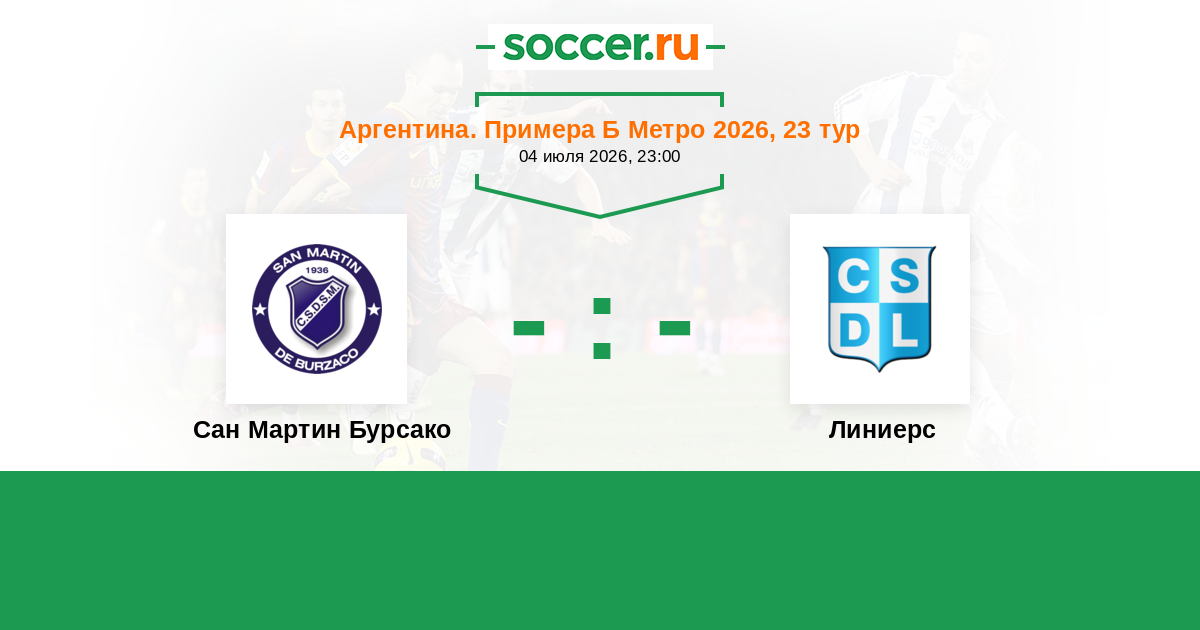 Аргентина. Примера Б Метро 20.07.2025 Сан Мартин Бурсако Логотип футбольный клуб Сан Мартин Бурсако 0:0 Логотип футбольный клуб Линиерс (Ла-Матанса) Линиерс