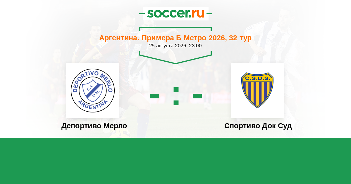 Аргентина. Примера Б Метро 18.10.2025 Спортиво Док Суд Логотип футбольный клуб Спортиво Док Суд (Буэнос-Айрес) 1:1 Логотип футбольный клуб Депортиво Мерло Депортиво Мерло