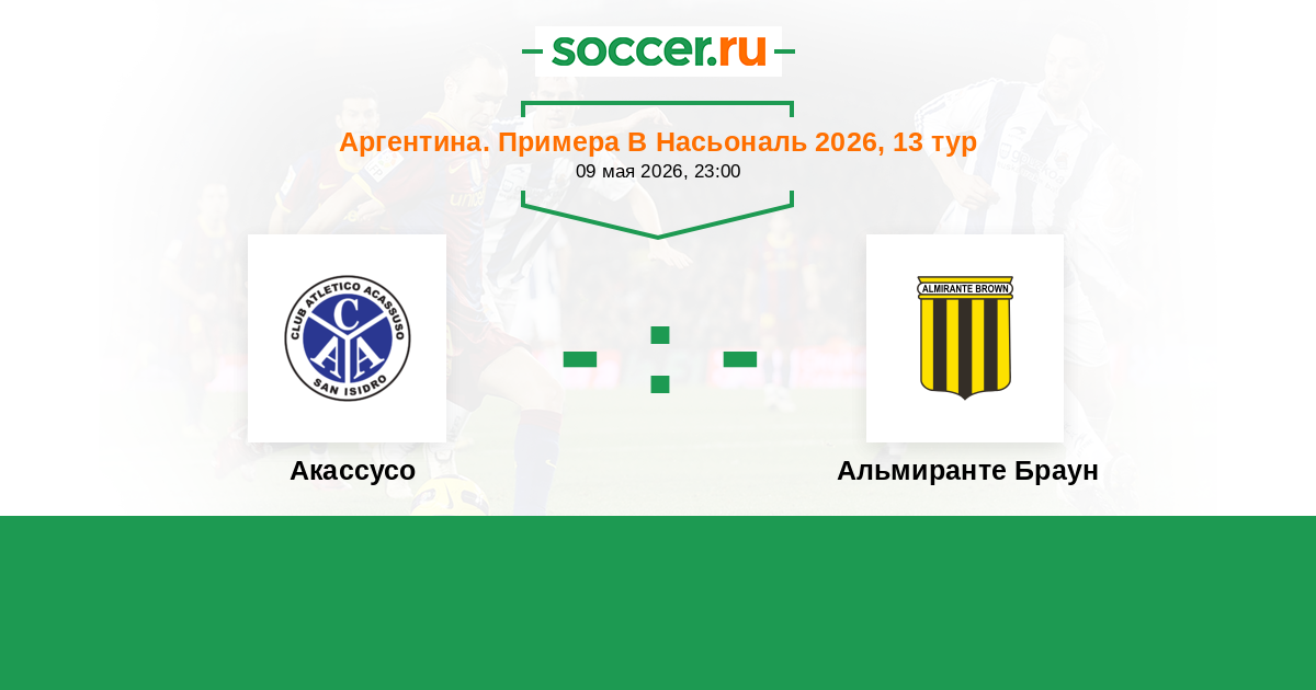 Аргентина. Примера Б Метро 20.03.2016 Акассусо Логотип футбольный клуб Акассусо (Сан-Исидро) 0:0 Логотип футбольный клуб Альмиранте Браун (Буэнос-Айрес) Альмиранте Браун
