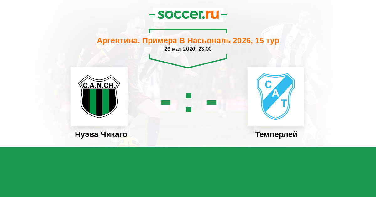 Аргентина. Примера Б Насьональ 26.02.2023 Темперлей Логотип футбольный клуб Темперлей (Тампрелей) 1:0 Логотип футбольный клуб Нуэва Чикаго ( Матадерос) Нуэва Чикаго