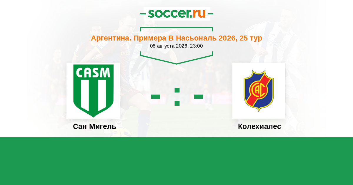 Аргентина. Примера Б Метро 25.01.2020 Сан Мигель Логотип футбольный клуб Сан Мигель 0:0 Логотип футбольный клуб Колехиалес (Висенте Лопес) Колехиалес
