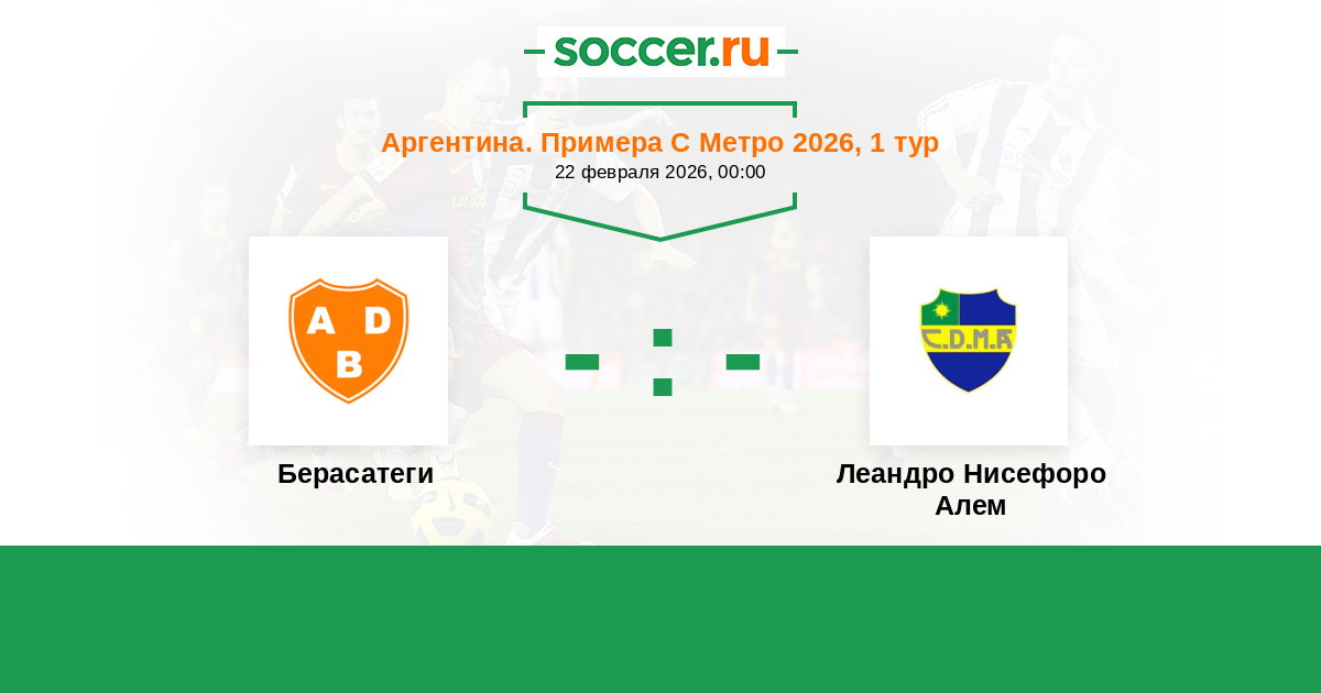 Аргентина. Примера С Метро 22.02.2018 Леандро Нисефоро Алем Логотип футбольный клуб Леандро Нисефоро Алем (Буэнос-Айрес) 4:2 Логотип футбольный клуб Берасатеги (Буэнос-Айрес) Берасатеги
