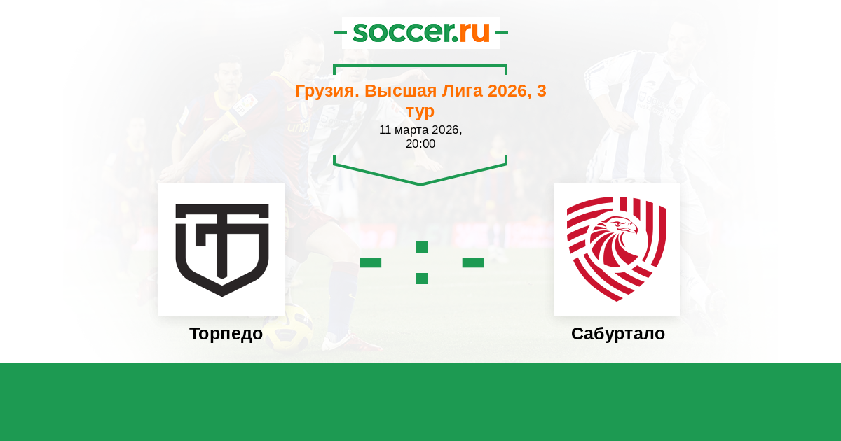 Грузия. Высшая лига 10.03.2021 Сабуртало Логотип футбольный клуб Сабуртало (Тбилиси) 0:0 Логотип футбольный клуб Торпедо (Кутаиси) Торпедо