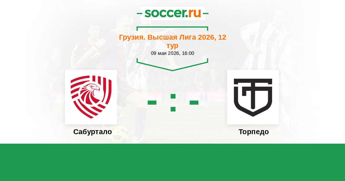Грузия. Высшая лига 16.09.2019 Сабуртало Логотип футбольный клуб Сабуртало (Тбилиси) 1:1 Логотип футбольный клуб Торпедо (Кутаиси) Торпедо