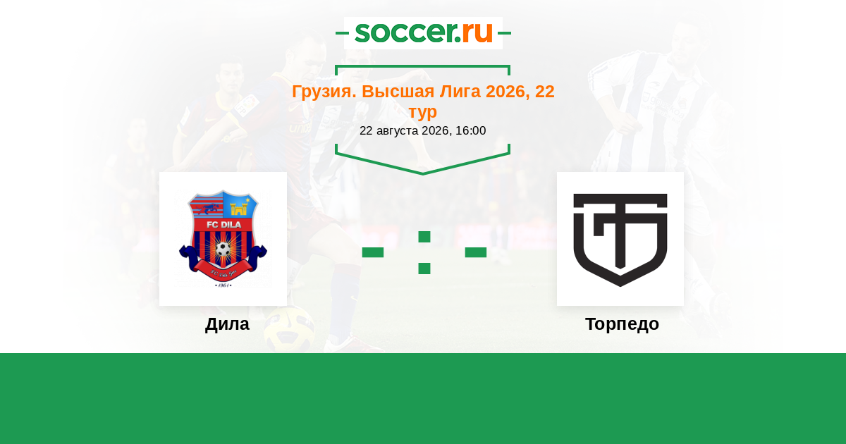 Грузия. Высшая лига 12.09.2021 Дила Логотип футбольный клуб Дила (Гори) 1:2 Логотип футбольный клуб Торпедо (Кутаиси) Торпедо