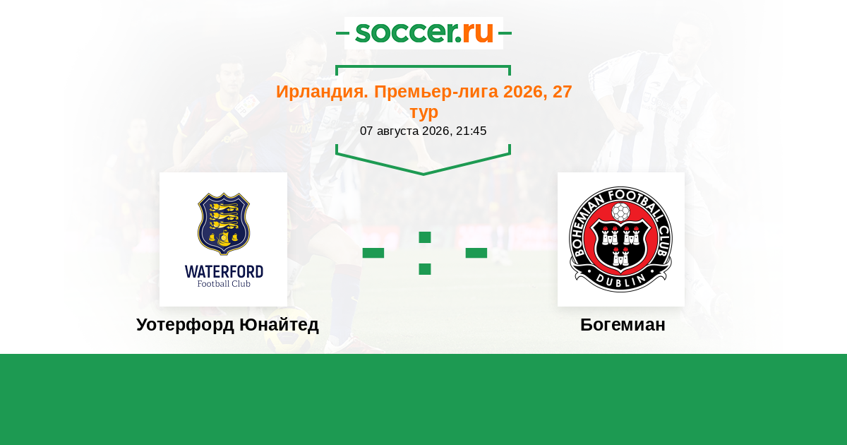 Ирландия. Премьер-лига 09.08.2024 Богемиан Логотип футбольный клуб Богемиан (Дублин) 2:3 Логотип футбольный клуб Уотерфорд Юнайтед Уотерфорд Юнайтед