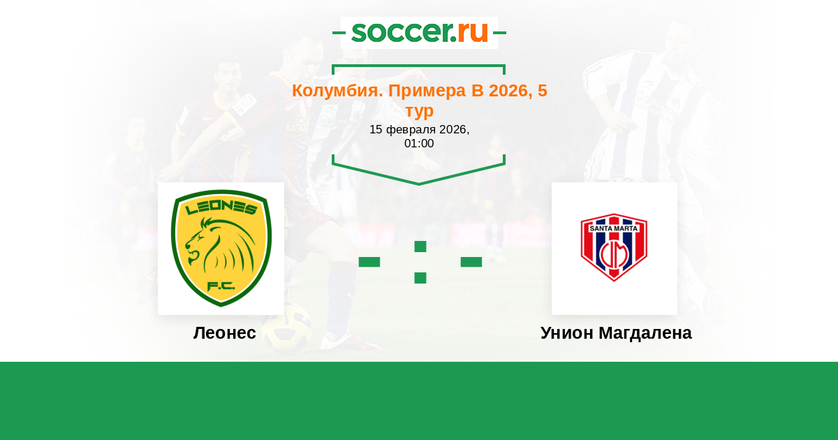 Колумбия. Примера B 04.09.2021 Леонес Логотип футбольный клуб Леонес (Итагуи) 3:0 Логотип футбольный клуб Унион Магдалена (Санта Марта) Унион Магдалена