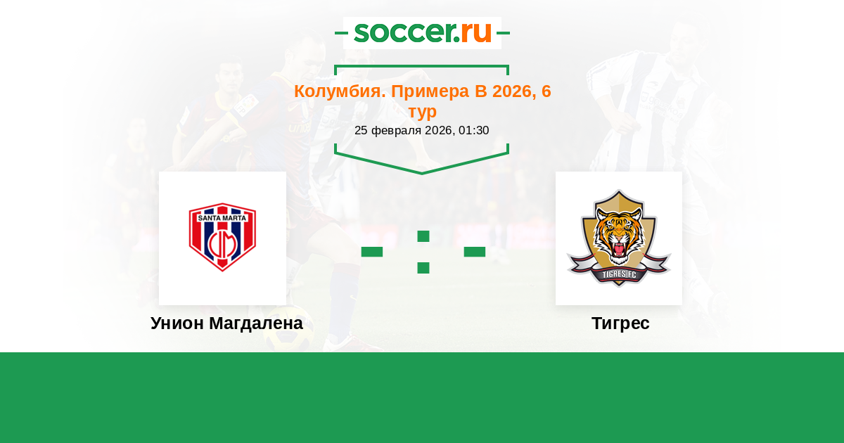 Колумбия. Примера B 26.01.2021 Тигрес Логотип футбольный клуб Тигрес (Сипакира) 1:1 Логотип футбольный клуб Унион Магдалена (Санта Марта) Унион Магдалена