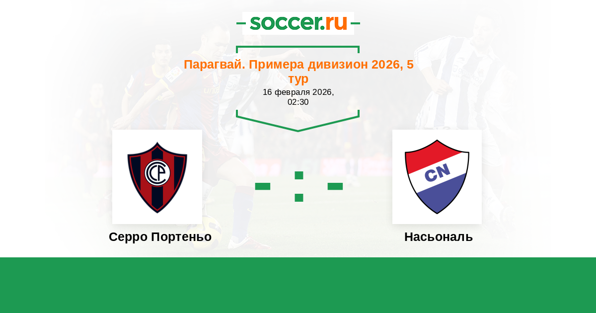 Парагвай. Примера дивизион 23.02.2019 Серро Портеньо Логотип футбольный клуб Серро Портеньо (Асунсьон) 1:1 Логотип футбольный клуб Насьональ (Асунсьон) Насьональ