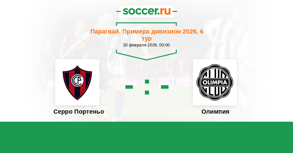 Парагвай. Примера дивизион 23.02.2020 Олимпия Логотип футбольный клуб Олимпия (Асунсьон) 1:1 Логотип футбольный клуб Серро Портеньо (Асунсьон) Серро Портеньо