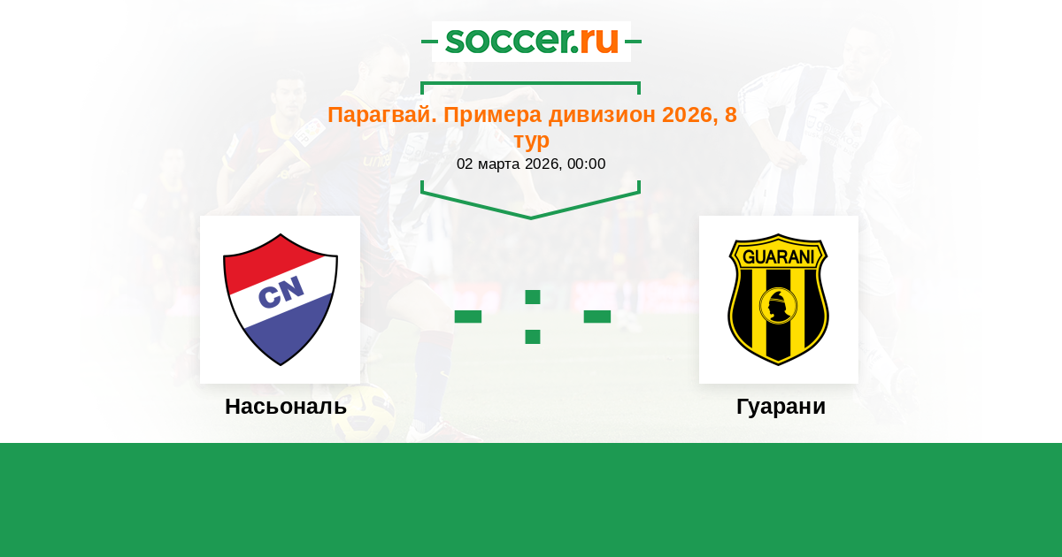Парагвай. Примера дивизион 02.04.2021 Насьональ Логотип футбольный клуб Насьональ (Асунсьон) 2:0 Логотип футбольный клуб Гуарани (Асунсьон) Гуарани