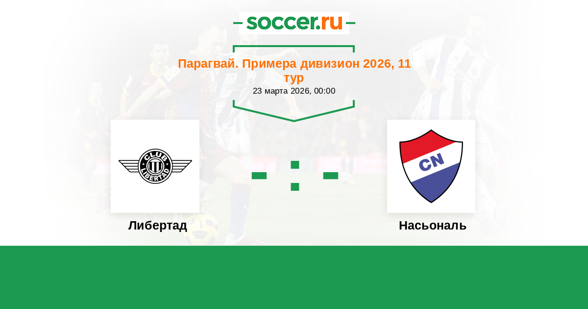 Парагвай. Примера дивизион 15.03.2022 Насьональ Логотип футбольный клуб Насьональ (Асунсьон) 0:3 Логотип футбольный клуб Либертад (Асунсьон) Либертад
