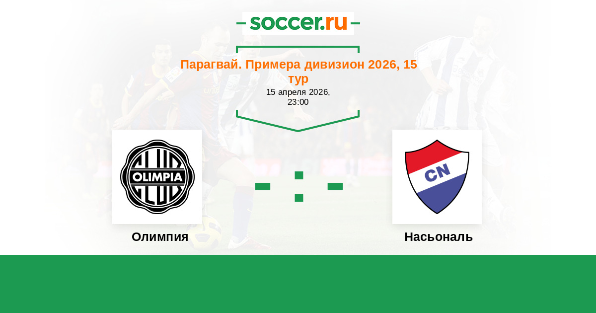 Парагвай. Примера дивизион 12.04.2015 Олимпия Логотип футбольный клуб Олимпия (Асунсьон) 1:0 Логотип футбольный клуб Насьональ (Асунсьон) Насьональ