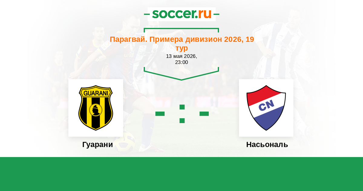 Парагвай. Примера дивизион 01.04.2019 Гуарани Логотип футбольный клуб Гуарани (Асунсьон) 2:2 Логотип футбольный клуб Насьональ (Асунсьон) Насьональ