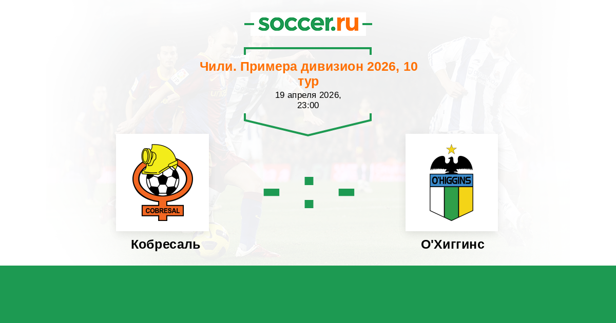 Чили. Примера дивизион 20.04.2019 О'Хиггинс Логотип футбольный клуб О'Хиггинс (Ранкагуа) 2:0 Логотип футбольный клуб Кобресаль (Эль-Сальвадор) Кобресаль