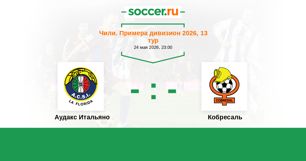 Чили. Примера дивизион 10.04.2022 Кобресаль Логотип футбольный клуб Кобресаль (Эль-Сальвадор) 0:1 Логотип футбольный клуб Аудакс Итальяно (Сантьяго) Аудакс Итальяно