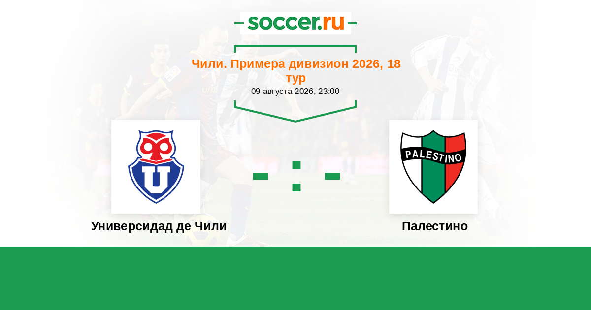Чили. Примера дивизион 30.08.2020 Палестино Логотип футбольный клуб Палестино (Сантьяго) 2:2 Логотип футбольный клуб Универсидад де Чили (Сантьяго) Универсидад де Чили