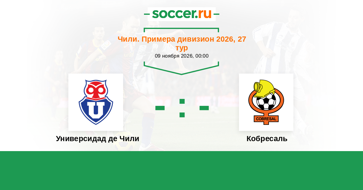 Чили. Примера дивизион 14.09.2020 Универсидад де Чили Логотип футбольный клуб Универсидад де Чили (Сантьяго) 2:1 Логотип футбольный клуб Кобресаль (Эль-Сальвадор) Кобресаль
