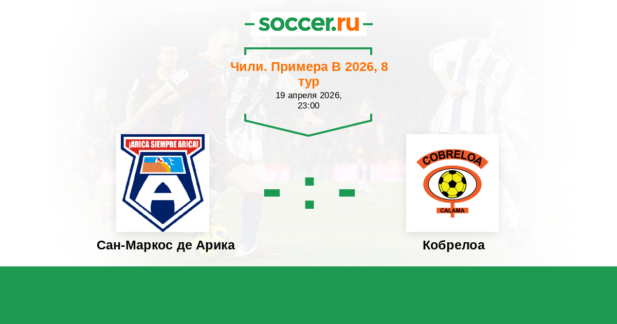 Чили. Примера В 19.04.2021 Сан-Маркос де Арика Логотип футбольный клуб Сан-Маркос де Арика 0:0 Логотип футбольный клуб Кобрелоа (Калама) Кобрелоа