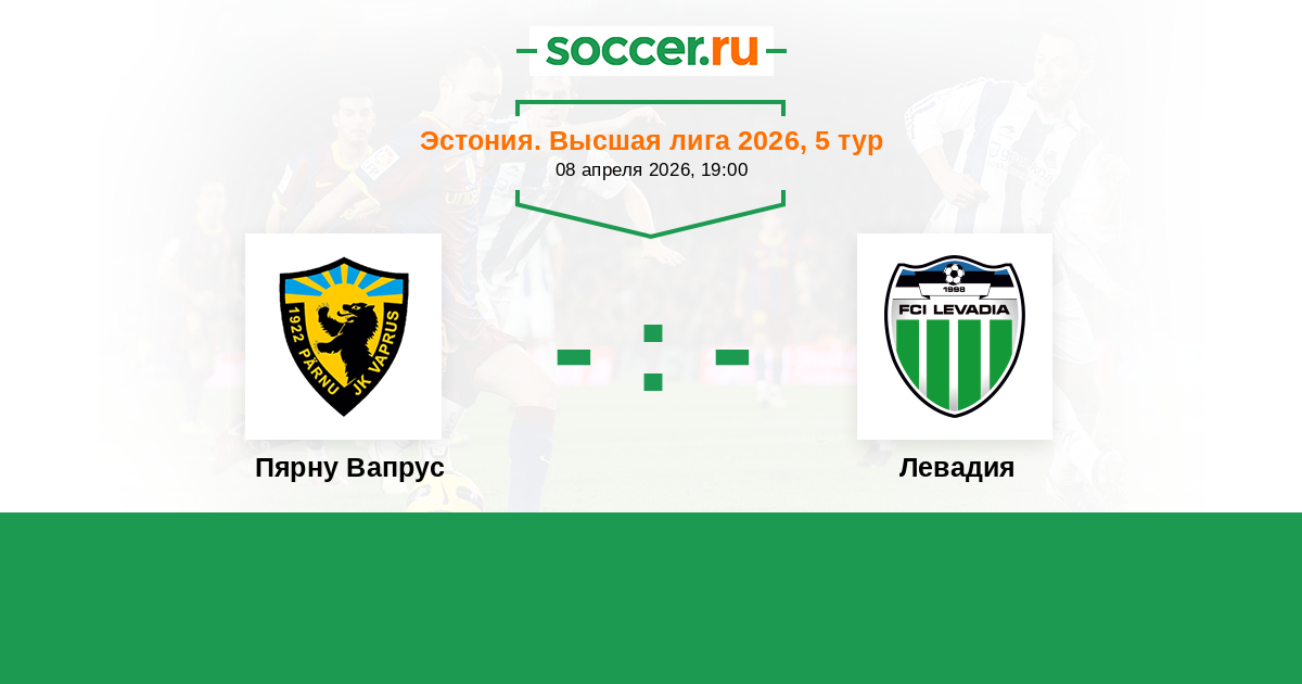 Эстония. Высшая лига 20.04.2024 Левадия Логотип футбольный клуб Левадия (Таллин) 1:1 Логотип футбольный клуб Пярну Вапрус Пярну Вапрус