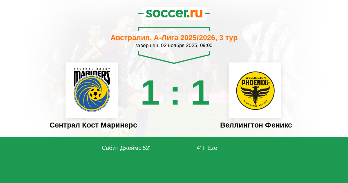 Протокол матча Сентрал Кост Маринерс против Веллингтон Феникс