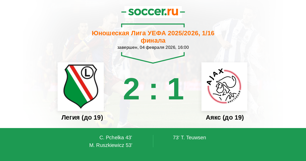 Протокол матча Легия (до 19) против Аякс (до 19)