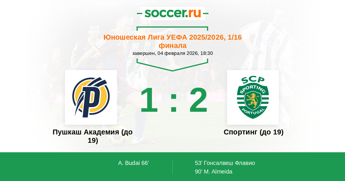 Протокол матча Пушкаш Академия (до 19) против Спортинг (до 19)