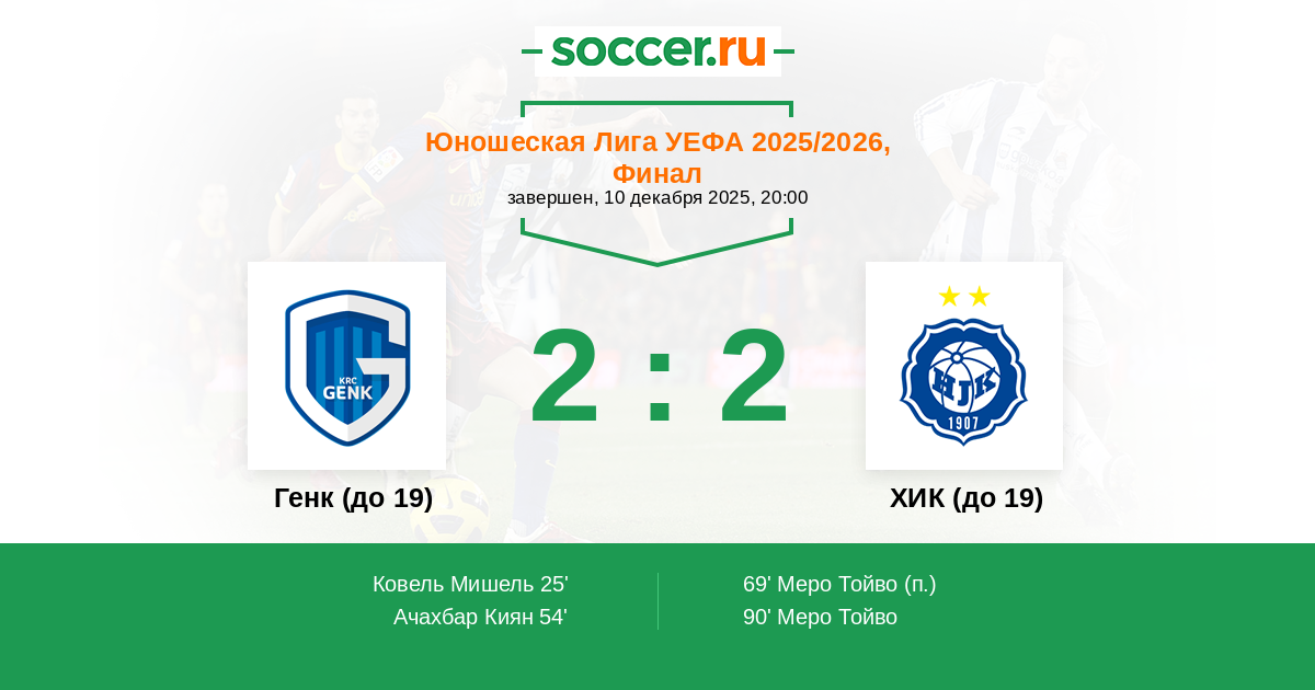 Протокол матча Генк (до 19) против ХИК (до 19)