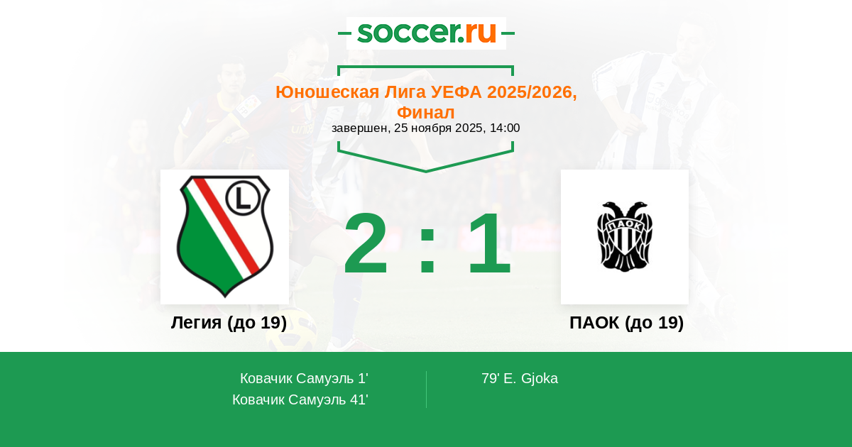 Протокол матча Легия (до 19) против ПАОК (до 19)
