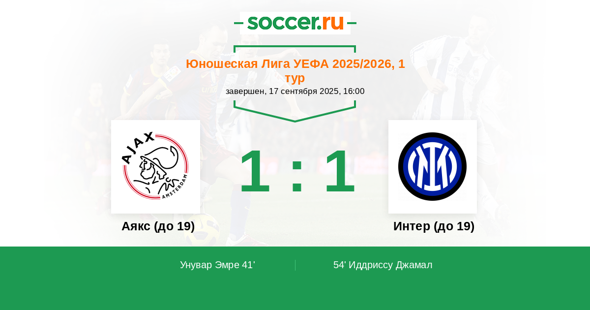 Протокол матча Аякс (до 19) против Интер (до 19)
