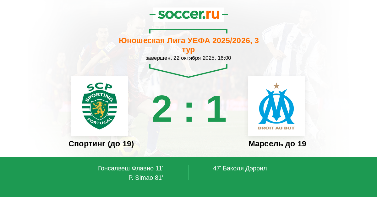Протокол матча Спортинг (до 19) против Марсель до 19