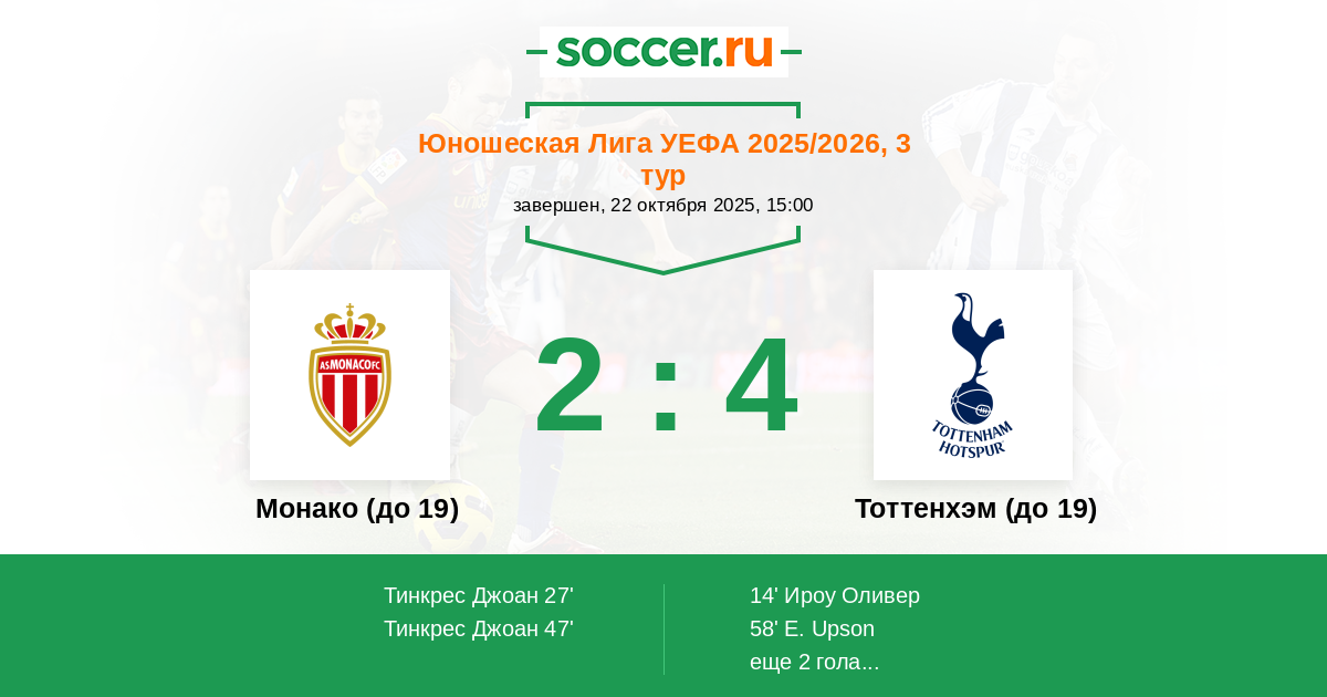 Протокол матча Монако (до 19) против Тоттенхэм (до 19)