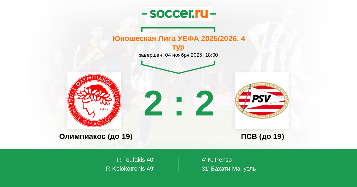 Протокол матча Олимпиакос (до 19) против ПСВ (до 19)